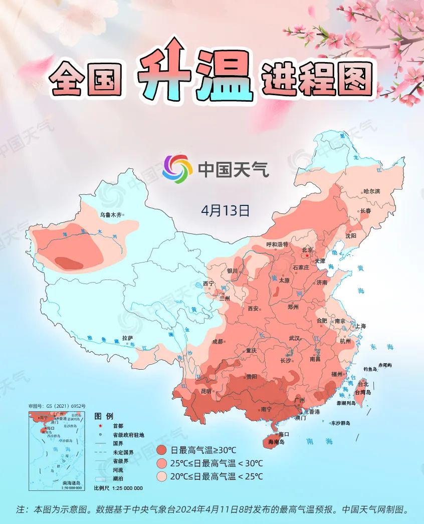 眼下,全国大部处于冷空气影响间歇期,升温是主旋律。预计今起三天(4月11日至13日),我国从北到南都将开启回暖进程,最高气温25℃以上的区域几乎覆盖整个中东部,波及20余省份,东北、西北地区气温将大面积创今年以来新高,北方不少地方还会体验到常年5月中旬才有的超前暖热。中国天气网推出全国升温进程图,看看哪些地方将冲击30℃。