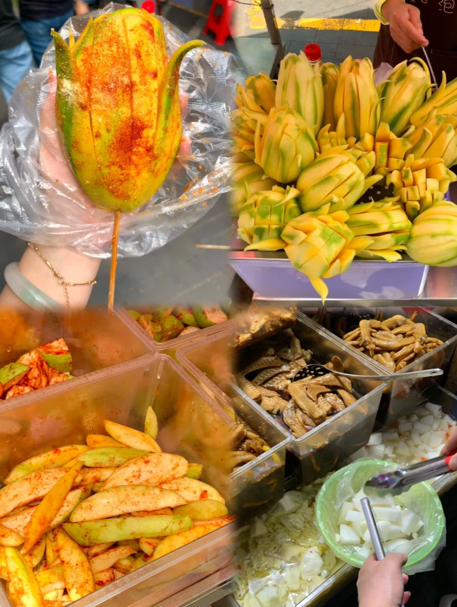 在海口,削了皮的新鲜水果,蘸上辣椒盐,味觉层次瞬间丰富,令人收获水果变“凉菜”的奇妙体验,其中芒果就是一个不错的选择。