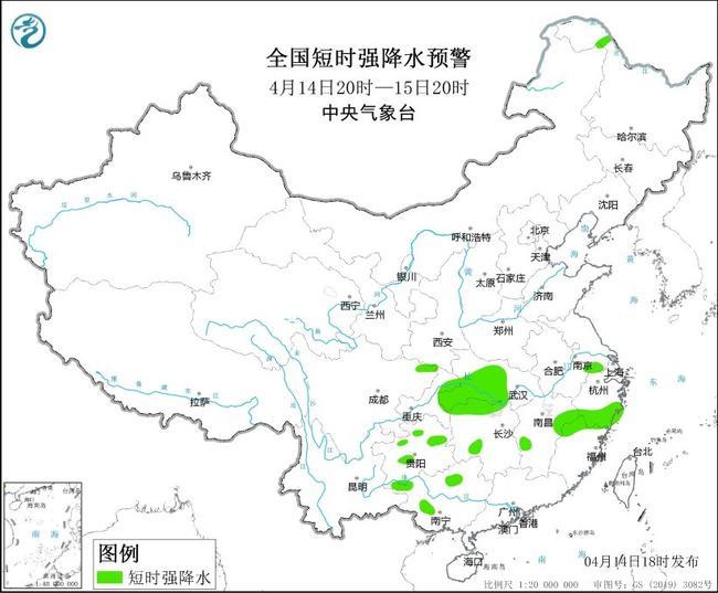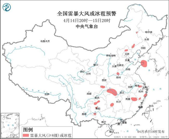 预计4月14日20时至15日20时,辽宁西部、河北北部、山东东部、湖北南部和西部、湖南北部和西南部、江西东北部、浙江中南部、福建西北部、四川盆地东北部、重庆东北部、贵州中部和北部、广西西北部等地的部分地区将有8—10级雷暴大风或冰雹天气;江苏西南部、湖北中南部、湖南北部和西南部、江西西部和东北部、浙江南部、福建西北部、重庆东北部、贵州中北部、广西西部和东北部等地的部分地区将有短时强降水天气,最大小时雨量20—40毫米,局地可达50毫米以上。