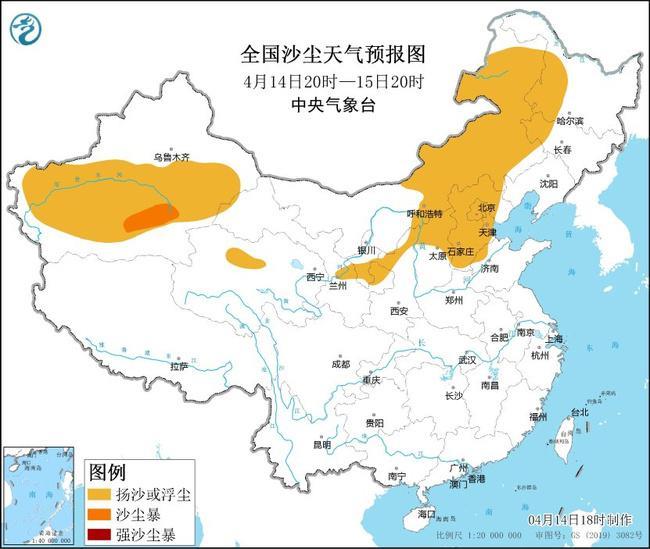 中央气象台4月14日18时继续发布沙尘暴蓝色预警:受冷空气大风影响,预计4月14日20时至15日20时,新疆南部、内蒙古中东部、宁夏南部、陕西北部、山西北部、北京、天津、河北大部、吉林西部、黑龙江西南部等地的部分地区有扬沙或浮尘天气,其中新疆南部局部有沙尘暴。