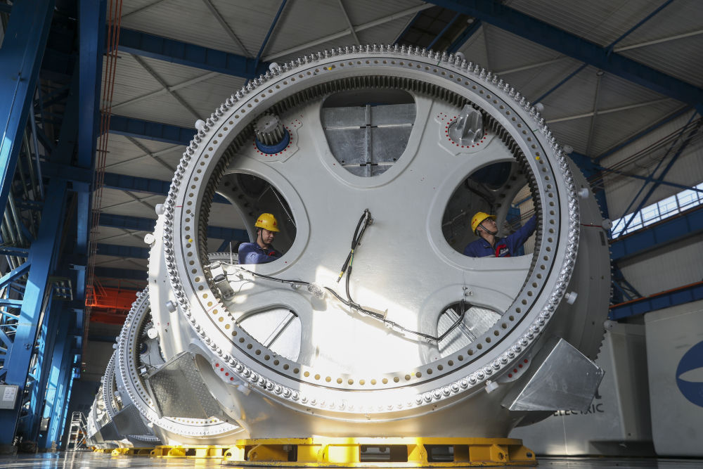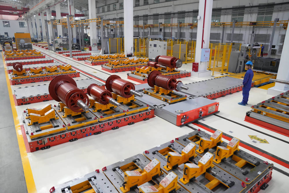 2024年3月5日,在位于黑龙江省齐齐哈尔市的中国一重集团有限公司风电装备生产制造厂生产车间,工作人员在组装设备。新华社记者 张涛 摄
