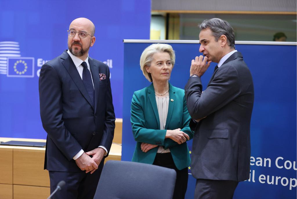 4月18日,在比利时布鲁塞尔,欧洲理事会主席米歇尔、欧盟委员会主席冯德莱恩和希腊总理米佐塔基斯(从左至右)在出席欧盟特别峰会期间交谈。新华社记者赵丁喆摄