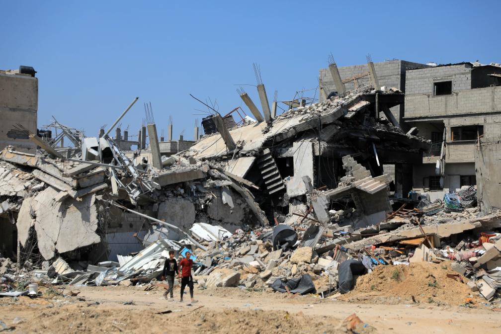 4月16日,在加沙地带南部城市汗尤尼斯,人们走过损毁的建筑。新华社发(里泽克·阿卜杜勒贾瓦德摄)