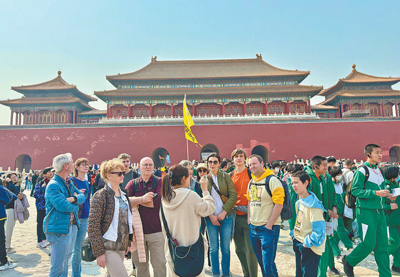 日前,比利时拂晓旅行社组织赴华旅行团利用十五天免签时限,游览了北京、贵州和广西。图为比利时游客在北京故宫游览。梵尚·沃姆摄
