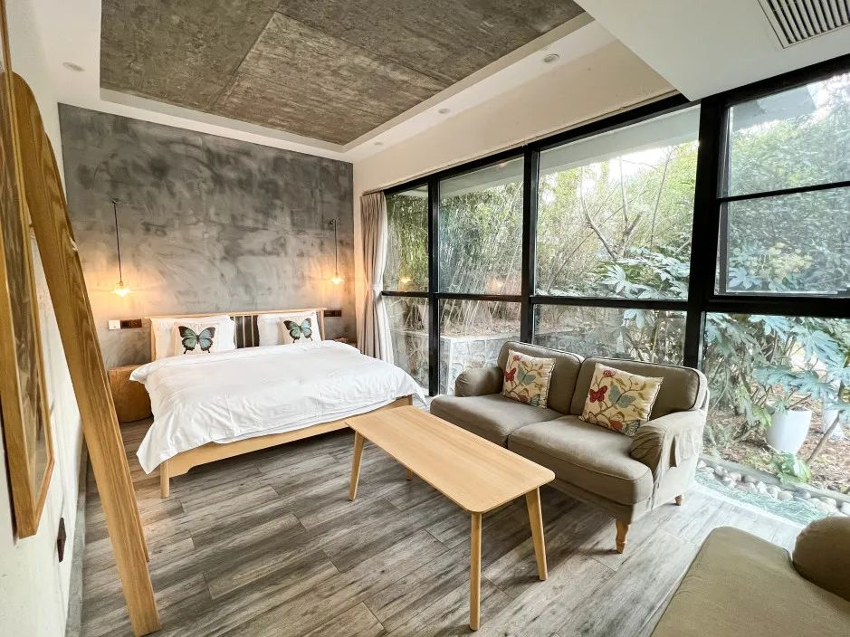 走进房间,干净与洁白的墙壁加上独特的蝴蝶装饰,灰白系的床品与家具、昏黄的灯光、富有诗意的房名、别出心裁的小设计,呼吸着清新自由的空气,在蝶梦山丘飞行民宿像蝴蝶一样轻盈生活。