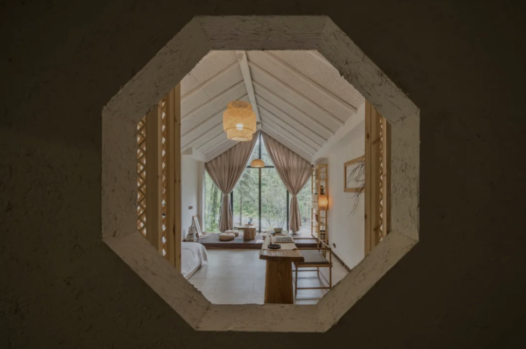 这是一处隐于山间的房子,将老房子改造,保留了山间的原汁原味,原木、清白、质朴、静谧。
