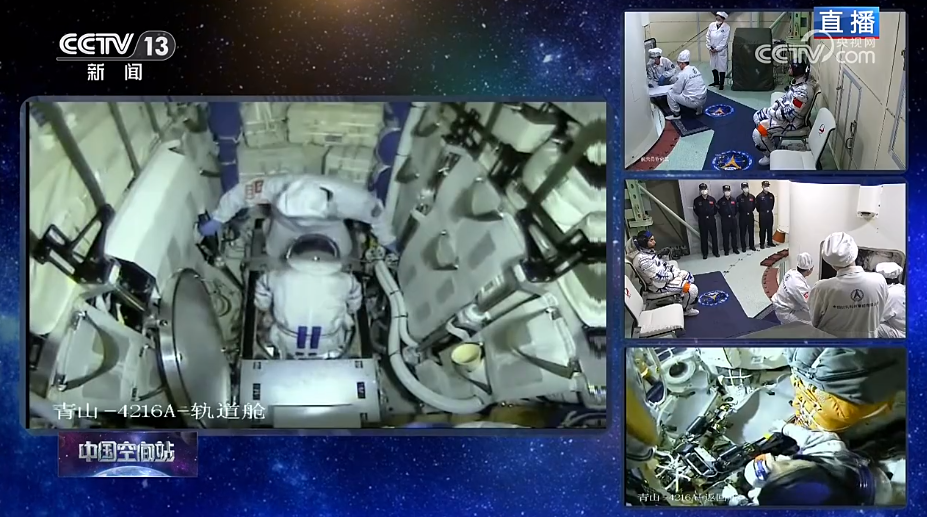 神舟十八号载人飞船瞄准今日20时59分发射。发射在即,航天员李广苏、李聪、叶光富依次进入飞船返回舱。