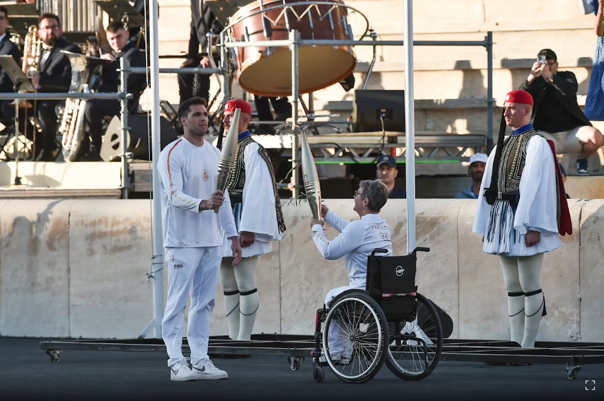 当天在帕纳辛奈科体育场的传递由两名希腊火炬手和两名法国火炬手共同完成,来自希腊的竞走世界冠军德里斯比奥蒂斯作为第一棒火炬手,将火种传给来自法国的2022年北京冬奥会花滑冰舞金牌得主帕帕达吉斯,随后帕帕达吉斯与法国游泳残奥会冠军赫斯完成交接,希腊国家水球队队长冯图利斯作为最后一棒火炬手点燃火盆。