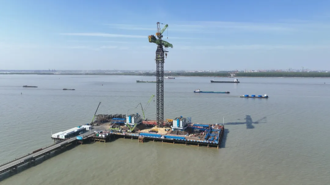 近日,张靖皋长江大桥南航道桥南主塔塔柱完成混凝土首次浇筑。