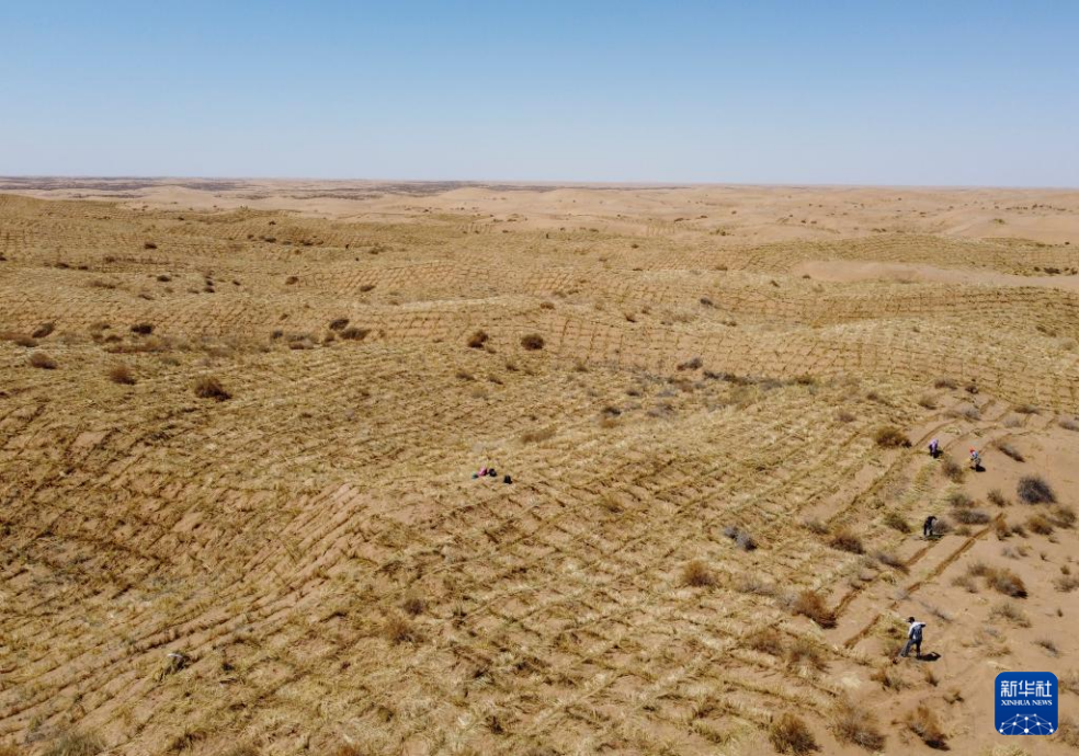 2024年4月10日,群众在古浪县八步沙林场麻黄塘沙区用草方格压沙。新华社发(无人机照片)