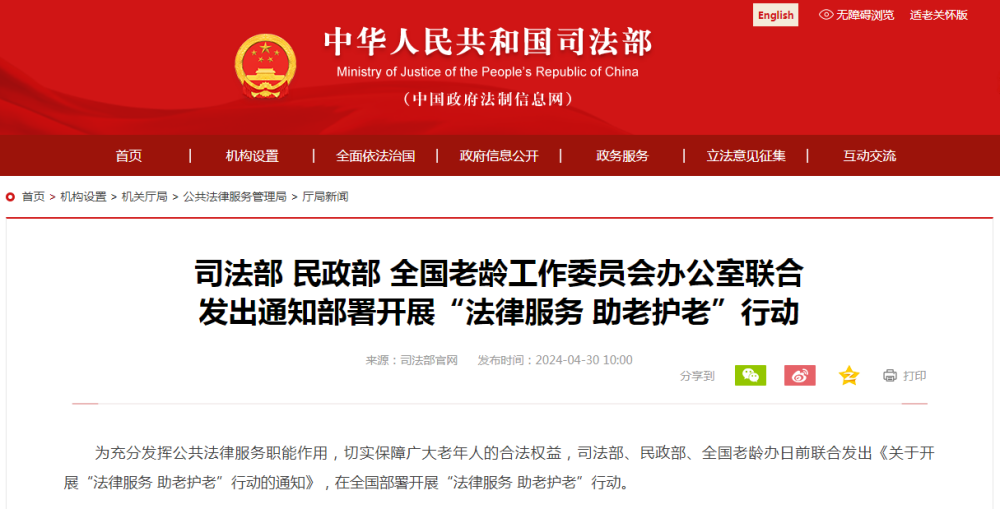司法部、民政部、全国老龄办日前联合发出《关于开展“法律服务 助老护老”行动的通知》,在全国部署开展“法律服务 助老护老”行动。行动聚焦老年人群体公共法律服务需求,推出6个方面措施。