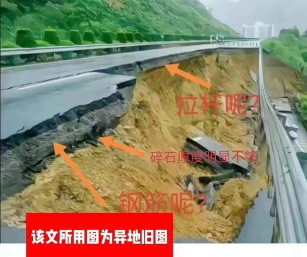 5月1日2时许,梅大高速茶阳路段发生塌方灾害,引发社会关注。网络上有自称为“一级建造师”的网友发布帖子称,通过塌方“现场图”可以发现,塌方路面的碎石基层厚度目测只有20厘米,混凝土里看不到一根钢筋,且交接两幅道路的中间纵缝看不到一根拉杆。该帖子还配上一张有相关标识的“现场图”,引发热议。