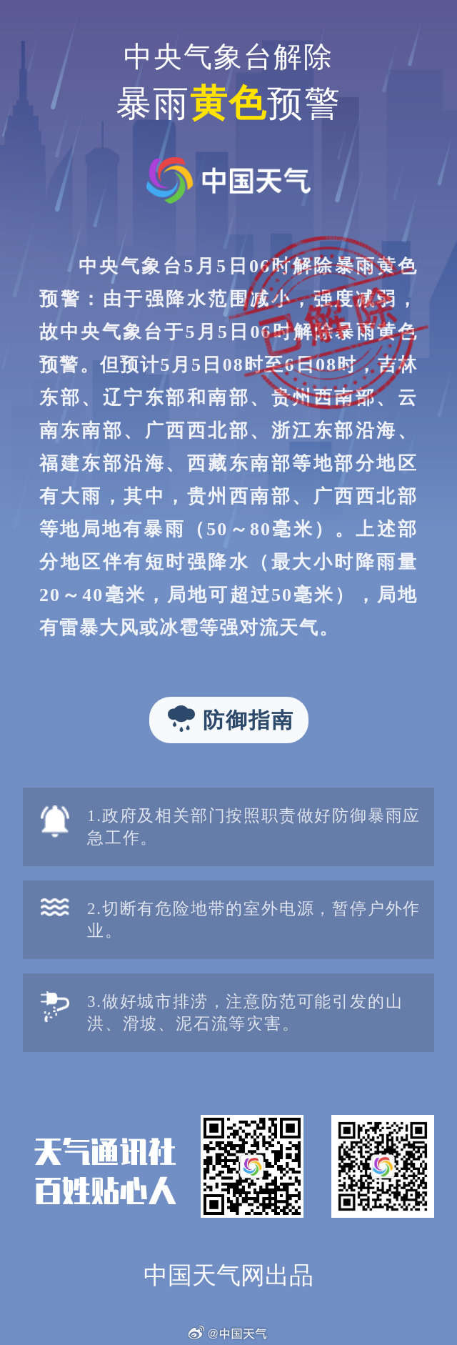 中央气象台5月5日06时解除暴雨黄色预警:由于强降水范围减小,强度减弱,故中央气象台于5月5日06时解除暴雨黄色预警。