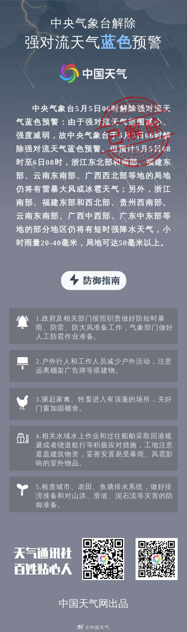 中央气象台5月5日06时解除强对流天气蓝色预警:由于强对流天气范围减小、强度减弱,故中央气象台于5月5日06时解除强对流天气蓝色预警。