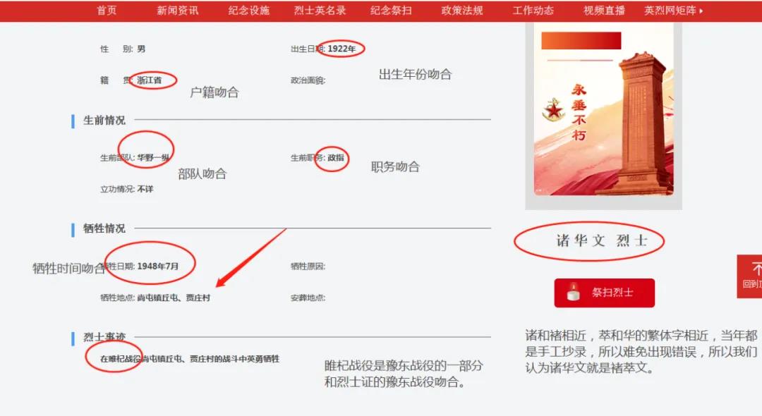 基本信息中,诸华文的出生年份、户籍、生前情况和牺牲情况都与褚萃文吻合;姓名方面,“诸”与“褚”偏旁相似,而华的繁体写法(華)与萃也有些相似,可能是登记时出现了错误。