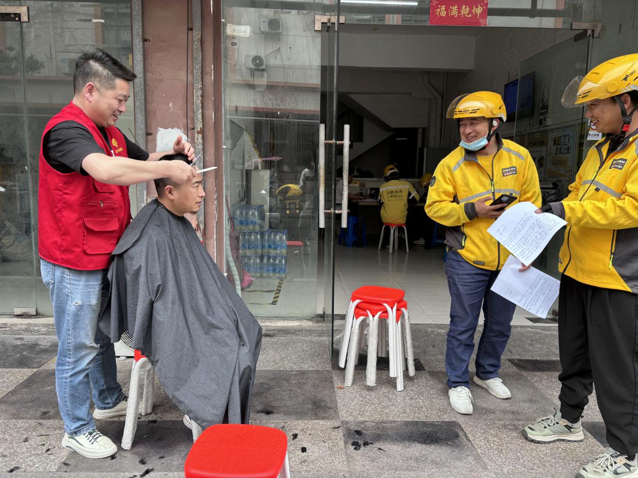 理发时,社区红色管家志愿者仔细倾听了小哥们的理发需求后,娴熟地为他们打造心仪的发型。没过多久,一张张面孔便显得神清气爽、精神焕发起来。美团兴浦站的王站长表示,小哥们平日里总是忙碌不停,单子堆积如山时,甚至连抽空去剪个头发都成了奢望,这次的活动切实解决了他们所需。一位刚享受完义剪服务的外卖小哥激动地说:“我一直想剪头发,但工作实在太忙了,根本抽不出时间。这次的义剪服务真是太贴心了!”