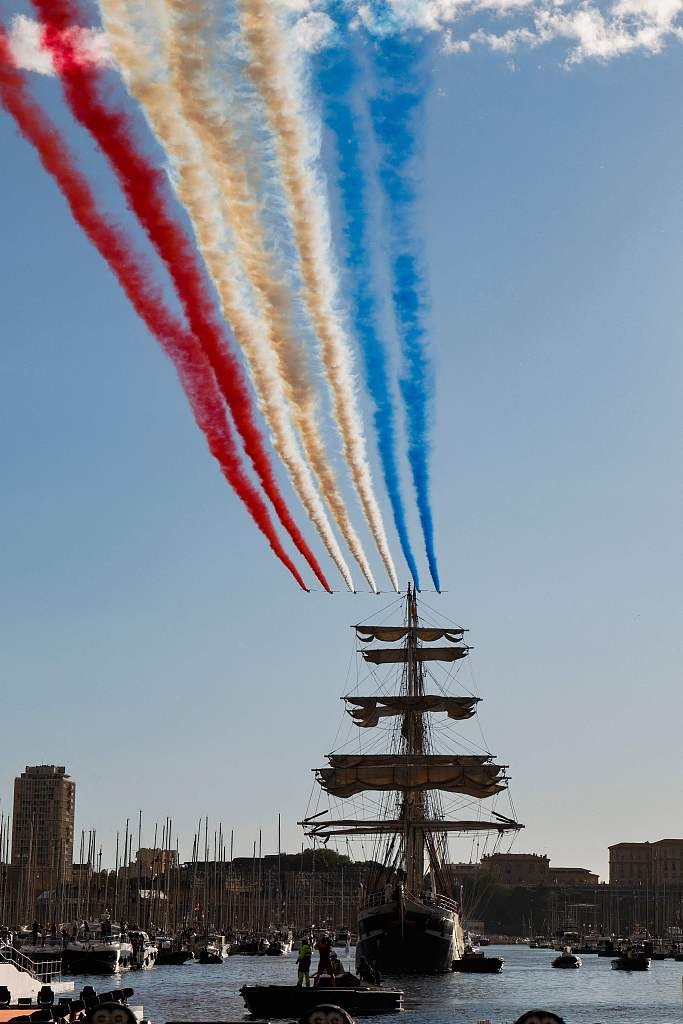 法国空军飞机盘旋在“贝伦”号帆船上空,用彩色烟雾在空中画出奥运五环的标志,随后又画出法国国旗的颜色。