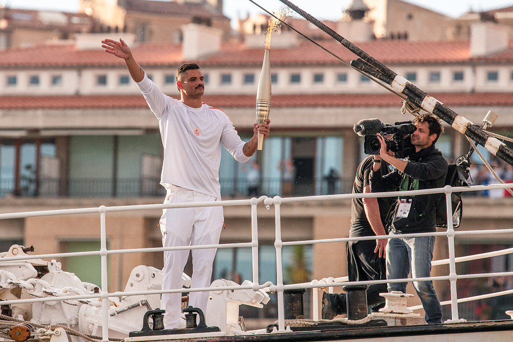 以奥运主题曲为背景,法国游泳运动员弗洛朗·马诺杜从“贝伦”号帆船上带下火种,他也由此成为巴黎奥运火炬传递的首名火炬手。作为一位来自马赛的运动员,他曾代表法国队参加过三届奥运会,获得1金3银。