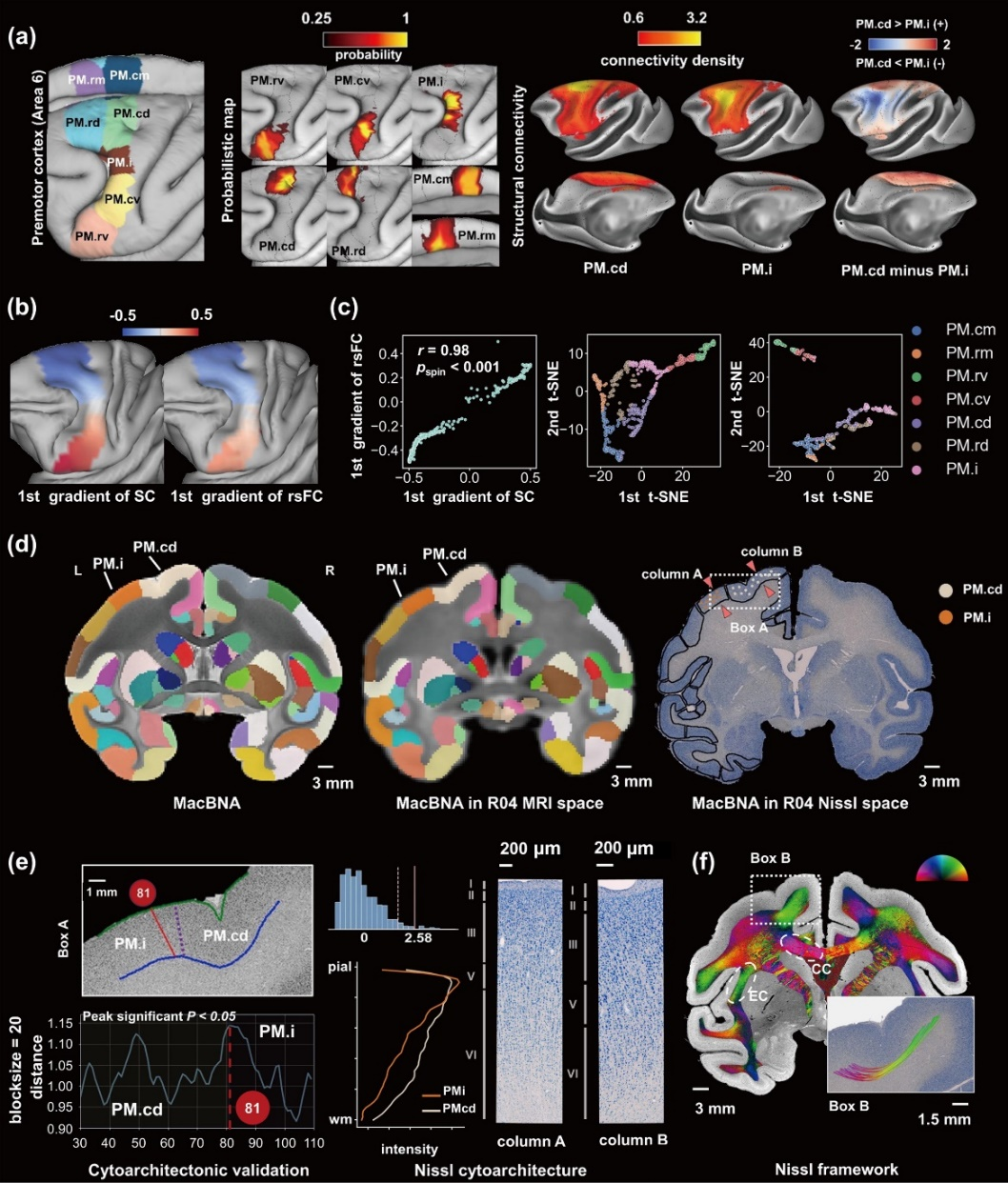 全新的猕猴脑网络组图谱不仅对脑区进行了合理且精细的分区,还详细描述了每个脑区亚区之间的宏观连接。作为可靠的参考系统,它能够有效地整合多尺度脑图像和多组学信息,从而绘制出多模态跨尺度的猕猴脑图谱。