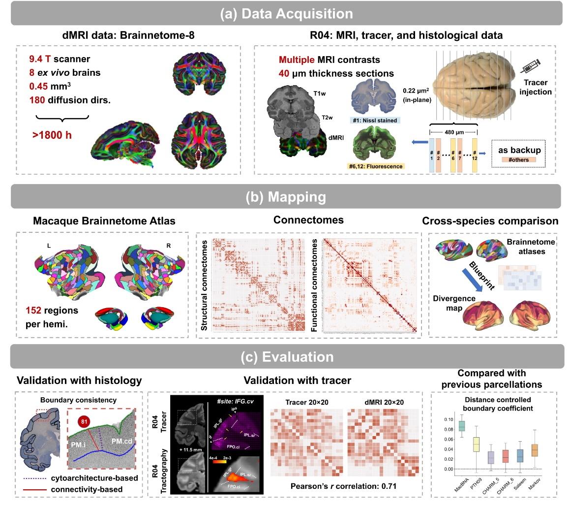 猕猴脑网络组图谱作为一套描绘猕猴脑部空间组织架构的全景式脑图谱,将克服现有图谱的诸多缺陷,包括仅针对特定解剖区域、仅有单一模态信息等局限性。同时,基于相同理论与方法绘制的人类和猕猴脑网络组图谱将为从猴脑获得的信息和知识有效地迁移到人脑发挥关键作用。