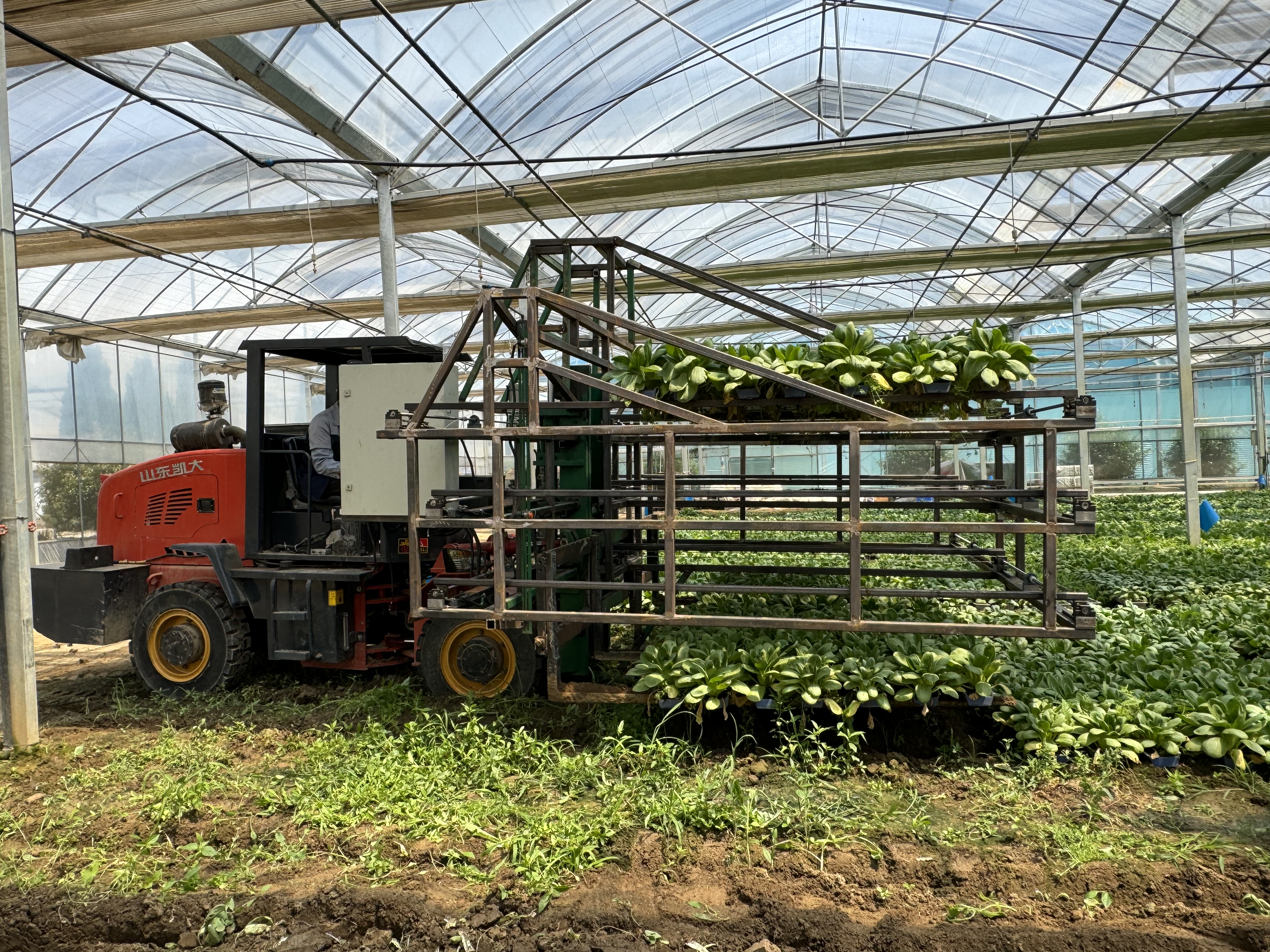 跟随搬运车下田“收菜”时,记者发现,为搬运种植槽而研制的装备背后藏着许多小巧思。比如,一台搭载了可以上下移动种植槽摆放架的叉车一次可以托起18槽青菜,4层搬运架一趟可运32平方米菜畦上的72槽青菜;生产线上的收割机刚好能将青菜沿靠土的根部切掉除,紧挨着的采收机卡口宽度恰好能将黄叶剥离掉。