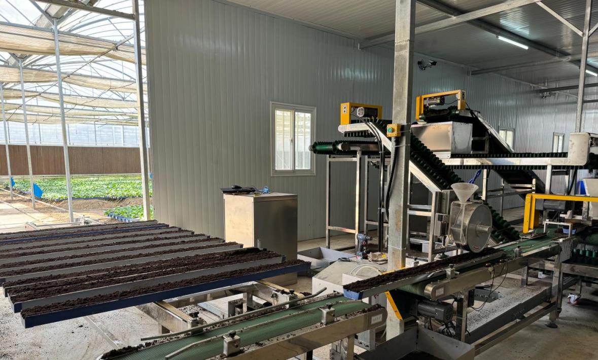 荣新科技总经理张贤东说,项目从2023年3月启动,到2023年底初具规模,仅用不到一年时间便完成了,这背后,离不开是省农科院专家学者们多年的科研积累。即便目前已经可以实现高效率的自动化生产,团队仍在不断通过完善技术提升产线的精准率和智能化水平。占地50亩的基地里,一侧大棚用于正常生产,另一侧大棚里则在开展对照实验,田块上插着“回收纯基质”“堆放基质”等标签。