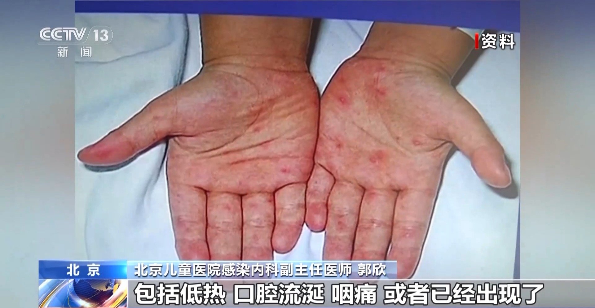 北京儿童医院感染内科副主任医师 郭欣:通过一些蛛丝马迹来早期发现,可以去仔细观察孩子的口腔、皮肤的黏膜,通常典型的症状就是累及手部、脚部,还有孩子的小屁屁上,可能会出现小红点。在潜伏期3—5天之后,孩子可能早期会出现一些包括低热、口腔流涎、咽痛,或者已经出现了手足或者臀部的这种皮疹,这样如果出现这样的症状,家长就一定要注意孩子可能罹患了手足口病。