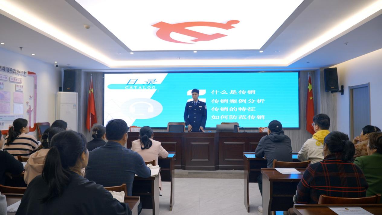活动现场,民警借助PPT展示,结合真实案例以案说法,同时摆放展板、发放反传销宣传资料、解答群众咨询等,揭露了传销组织的惯用手段,对传销的类型、危害性,鉴别防范传销的方法及相关法律知识等进行了宣传讲解,使群众充分认识到传销活动的欺诈性、隐蔽性和危害性,提高群众识别、防范传销的意识和能力,为群众打了防范传销的“预防针”,引导全社会形成共同抵制、防范传销的良好氛围。