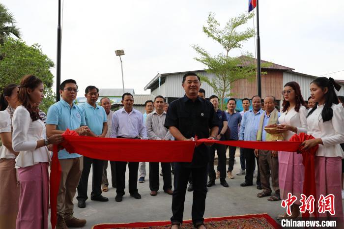 当地时间5月12日,柬埔寨民间社会组织联盟论坛主席盖里维希为新落成的村民中心剪彩。中新社记者 杨强 摄