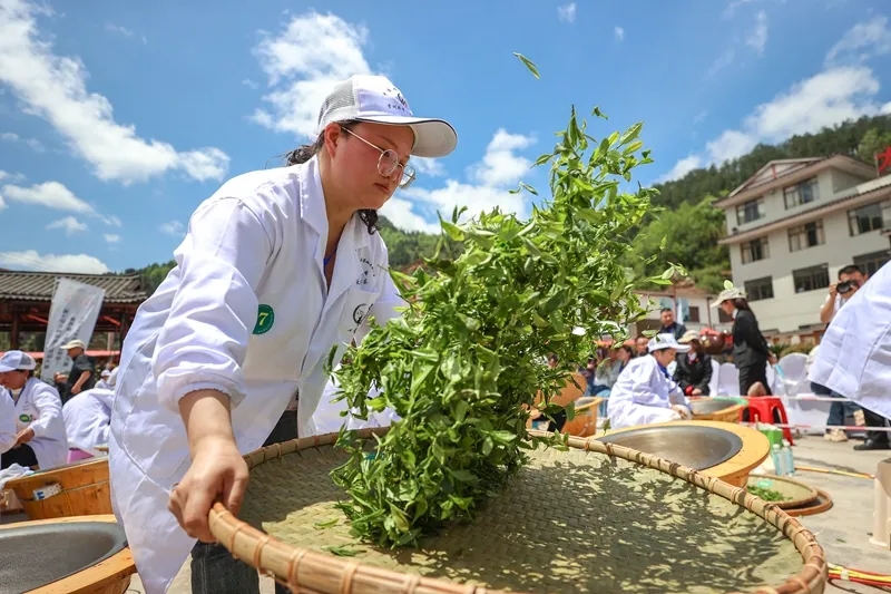 4月19日,2024年贵州省“太极古茶杯”第七届古树茶加工技能大赛在毕节市七星关区亮岩镇太极村举行。来自贵州各地13个代表队上百名选手同台切磋技艺,传承茶叶传统加工工艺,打造古树茶加工交流学习平台,进一步助推全省茶产业高质量发展。图为2024年4月19日,参赛选手参加绿茶加工项目比赛。人民图片 陈曦/摄