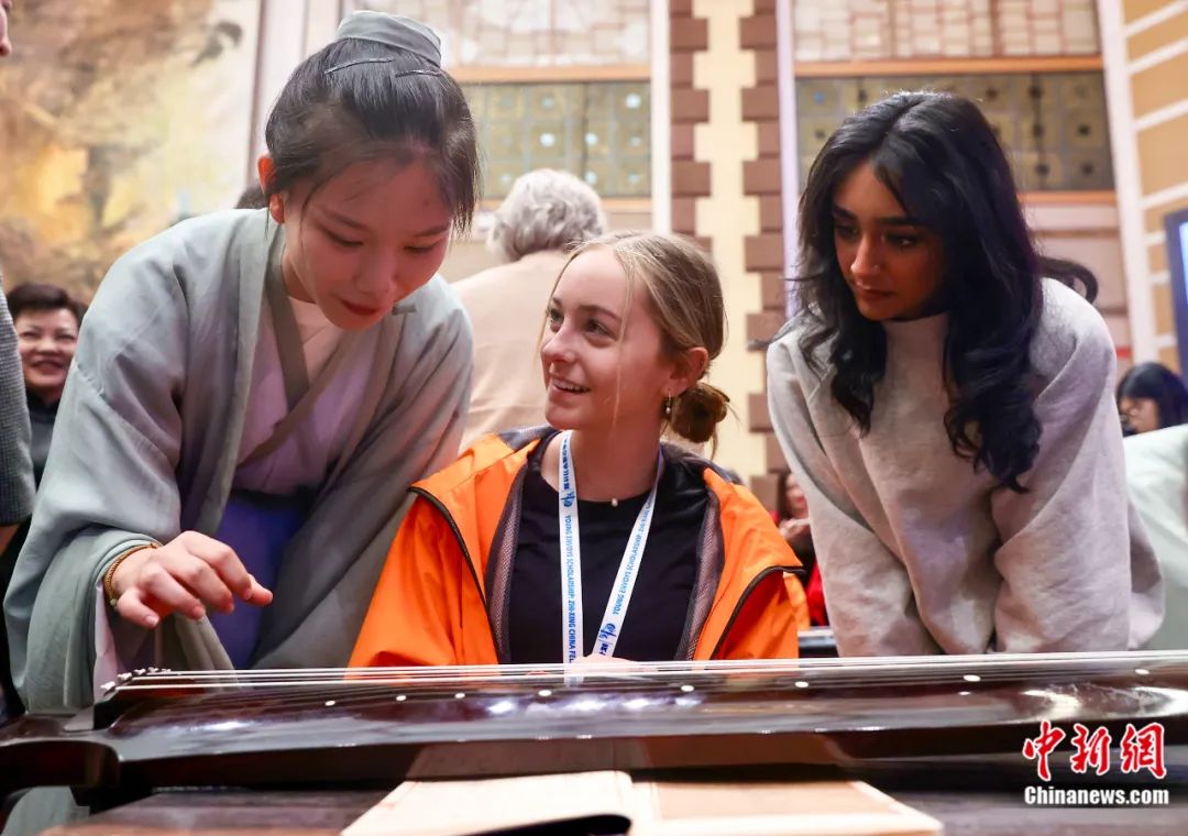 2024年3月20日上午,中美学子在北京大学开展交流,来自华盛顿州的两名中学生体验古琴。易海菲 摄