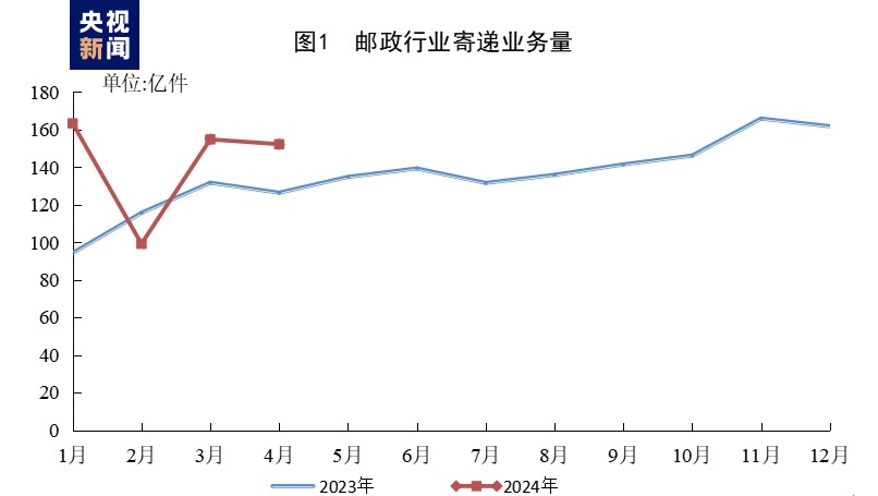 1—4月,邮政行业寄递业务量累计完成569.5亿件,同比增长21.7%。其中,快递业务量累计完成508.1亿件,同比增长24.5%(按可比口径计算,下同)。