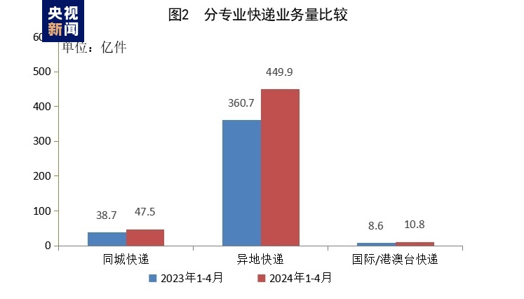 1—4月,同城快递业务量累计完成47.5亿件,同比增长22.6%;异地快递业务量累计完成449.9亿件,同比增长24.7%;国际/港澳台快递业务量累计完成10.8亿件,同比增长25.2%。