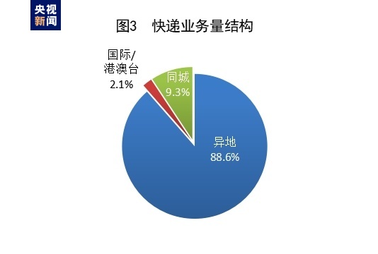 1—4月,同城、异地、国际/港澳台快递业务量分别占全部快递业务量的9.3%、88.6%和2.1%。与去年同期相比,同城快递业务量的比重下降0.2个百分点,异地快递业务量的比重上升0.2个百分点,国际/港澳台业务量的比重基本持平。