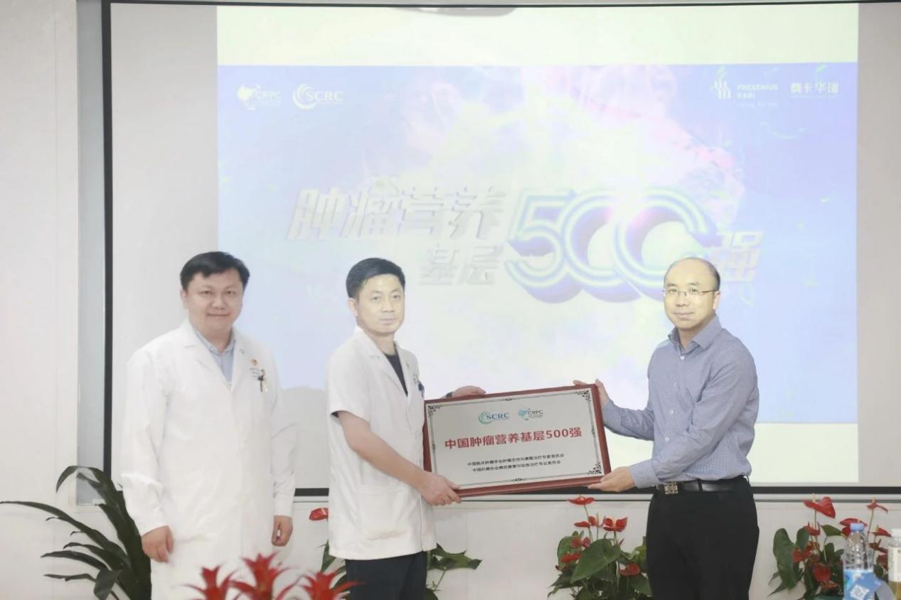 中国抗癌协会肿瘤营养专业委员会常委兼副秘书长陈晓锋、南京市浦口人民医院院长蔡强、肿瘤内科副主任方岳雨共同为南京市浦口人民医院“中国肿瘤营养基层500强”揭牌。