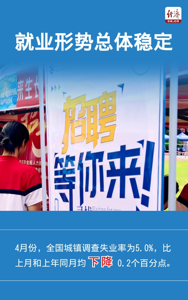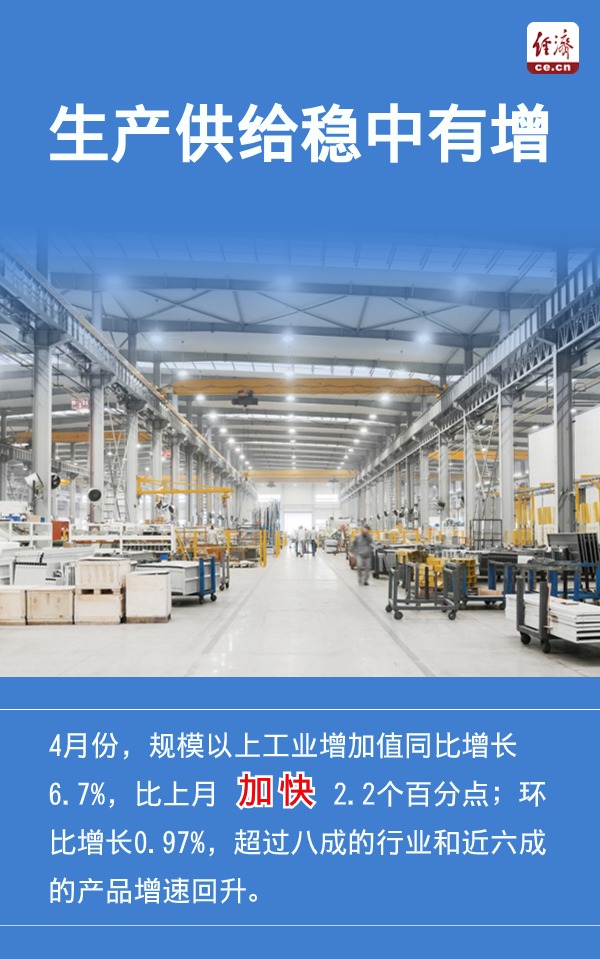 国家统计局5月17日发布1-4月份国民经济运行情况。4月份,规模以上工业增加值等多个数据指标呈现“加快”增长态势,显示生产需求平稳增长。4月份,全国城镇调查失业率比上月和上年同月均下降0.2个百分点,反映出就业形势总体稳定。