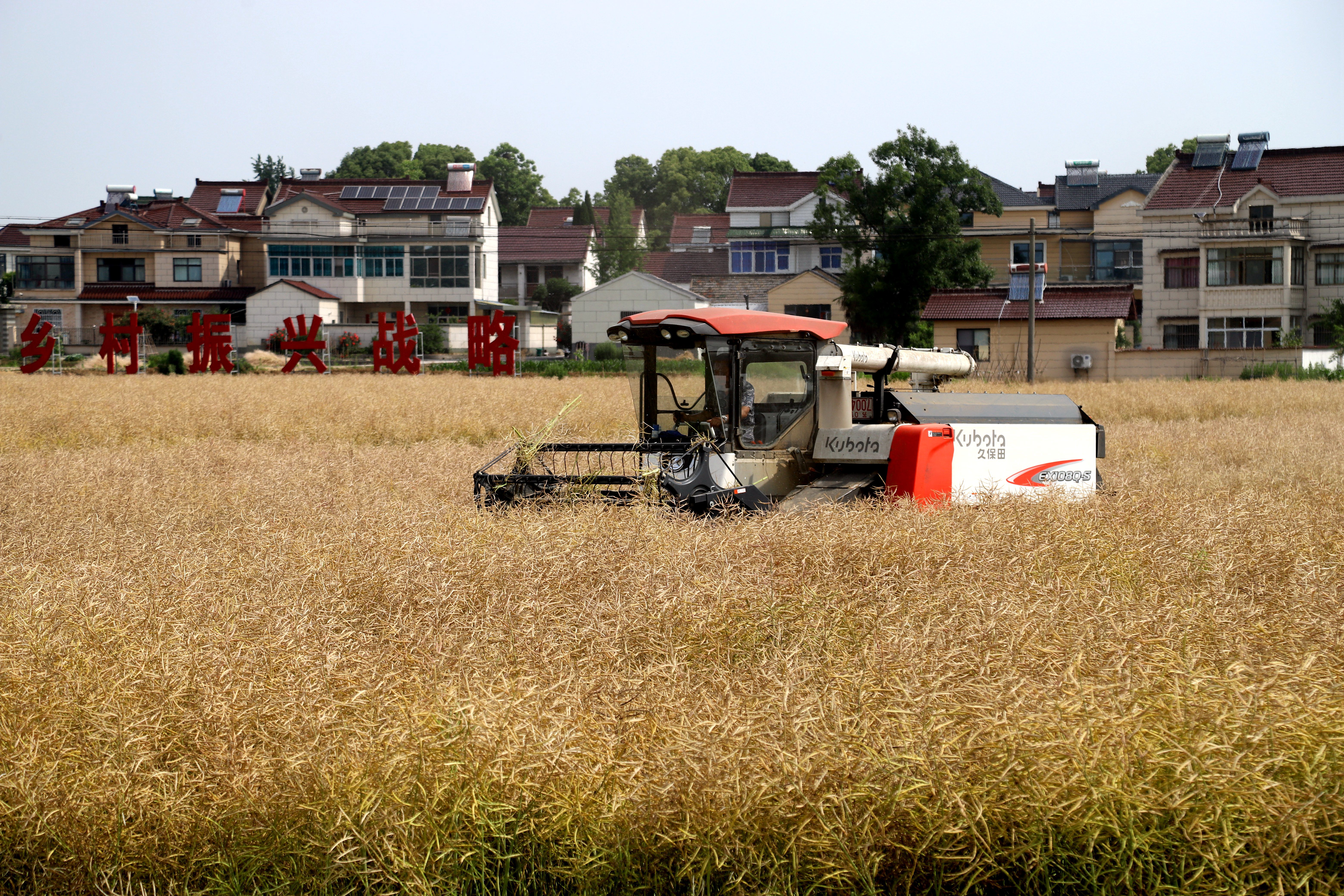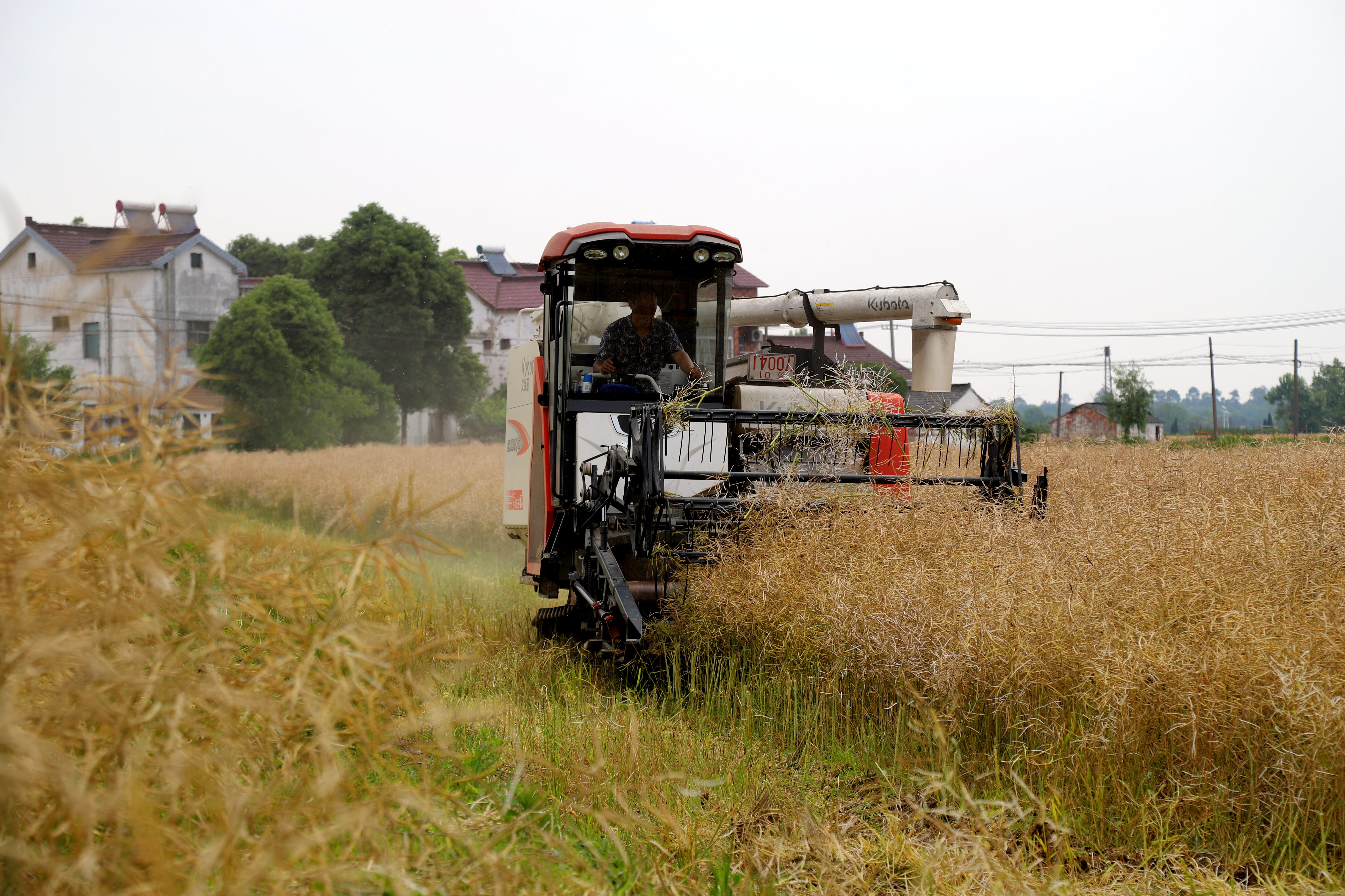 5月20日,在南京市高淳区桠溪街道新龙家庭农场内,收割机正在农田里作业收割油菜籽。据悉,当日是小满节气,也是夏熟油菜籽收获时节,为确保油菜籽颗粒归仓,该农场组织机械深入田间加快油菜籽收割进程。