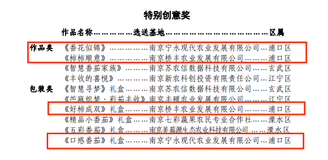 南京宁永现代农业发展有限公司的参赛作品《番花似锦》、南京桥丰农业发展有限公司的参赛作品《柿柿顺意》荣获作品类特别创意奖;南京桥丰农业发展有限公司的参赛作品《好柿成双》礼盒、南京宁永现代农业发展有限公司的参赛作品《口感番茄》礼盒荣获包装类特别创意奖。