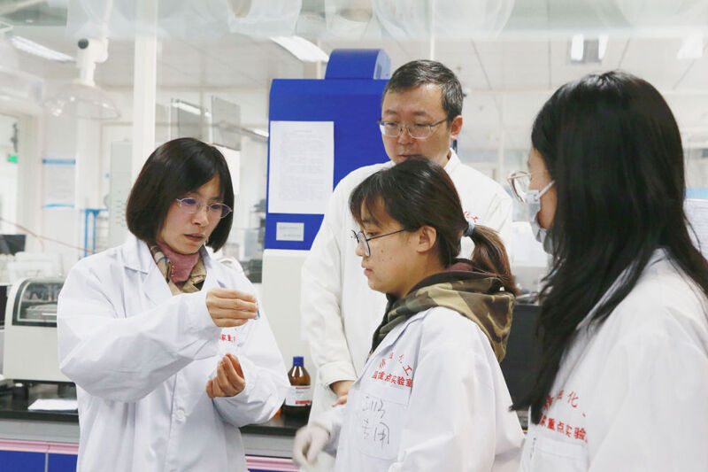 大连理工大学化工学院樊江莉(左)教授与同事及学生查看实验结果(2021年11月摄)。新华社发