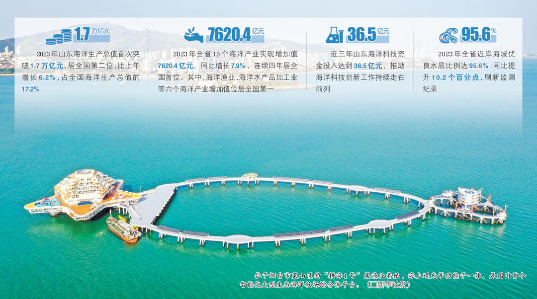 耕耘蔚蓝,向大海要发展。山东发挥自身区位与资源优势,把海洋产业作为强省建设的重要抓手,大力培育海洋牧场综合体、海洋大数据等海洋产业新业态,构建完善现代海洋产业体系。2023年,全省15个海洋产业实现增加值7620.4亿元,连续四年居全国首位。