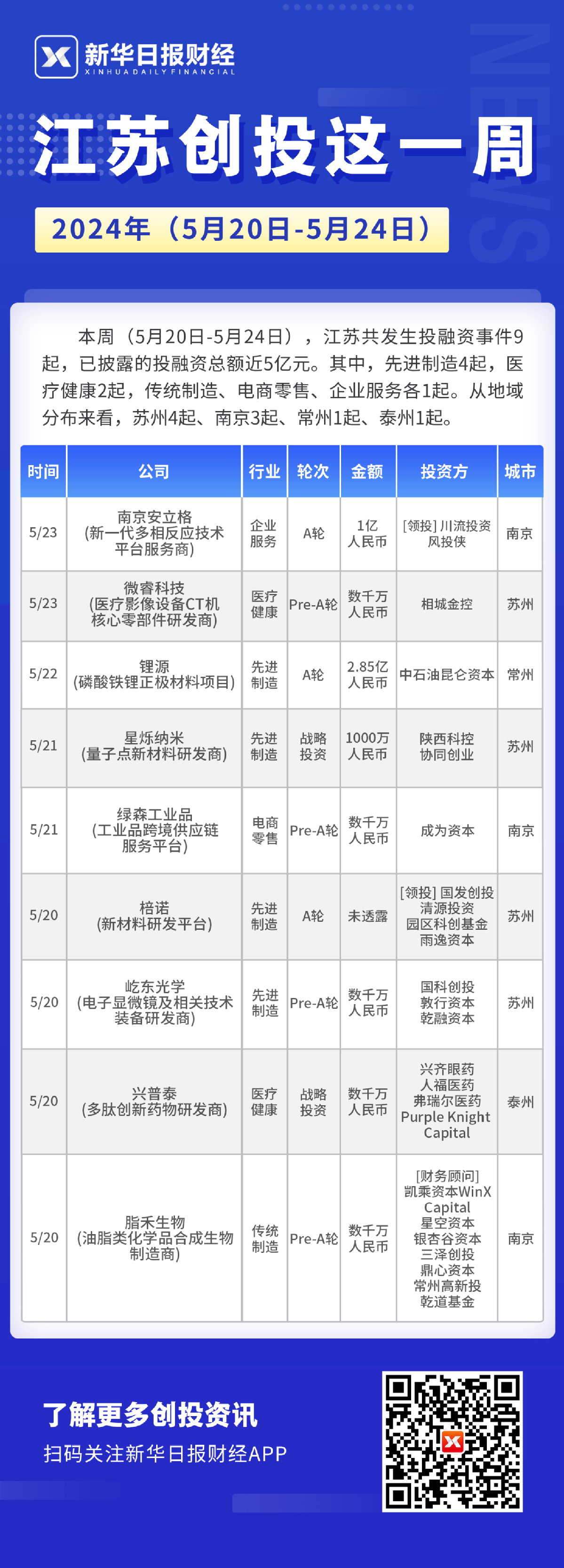 新华日报财经讯 本周(5月20日-5月24日),江苏共发生投融资事件9起,已披露的投融资总额近5亿元。其中,先进制造4起,医疗健康2起,传统制造、电商零售、企业服务各1起。从地域分布来看,苏州4起、南京3起、常州1起、泰州1起。
