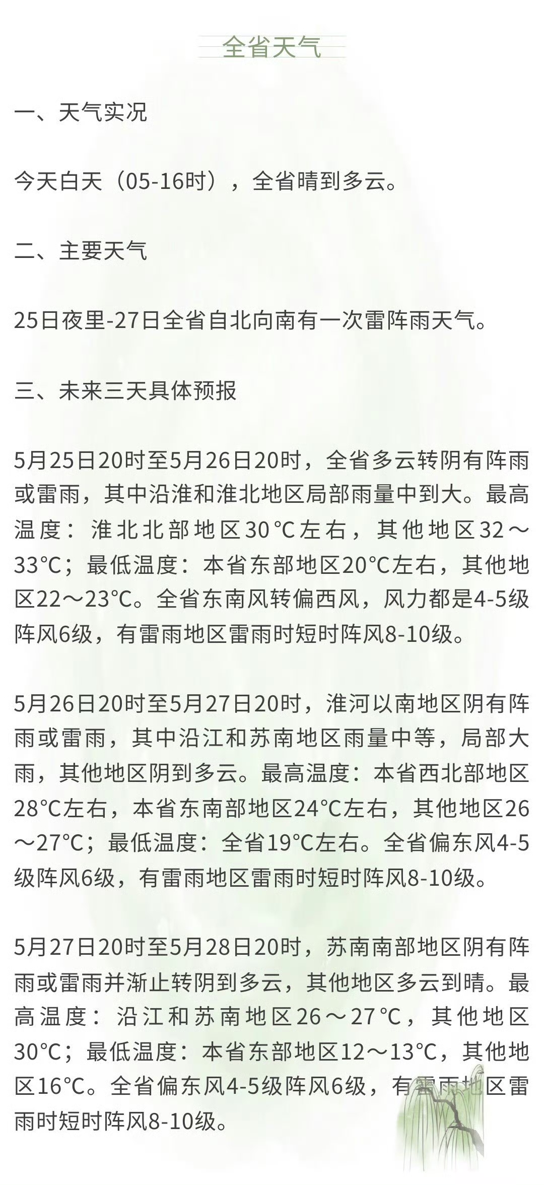 5月25日夜里至27日,全省自北向南有一次雷阵雨天气。5月25日20时至26日20时,全省多云转阴有阵雨或雷雨,其中沿淮和淮北地区局部雨量中到大。最高温度:淮北北部地区30℃左右,其他地区32~33℃;最低温度:本省东部地区20℃左右,其他地区22~23℃。全省东南风转偏西风,风力都是4~5级阵风6级,有雷雨地区雷雨时短时阵风8~10级。