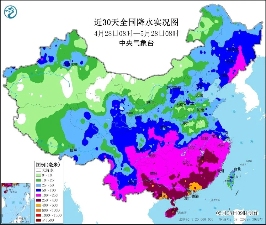 近30天,南方大部降雨明显,其中广西、海南、广东、福建等部分地区的降雨最为突出,在降水实况图中是比其他地区更显眼的一抹红色。