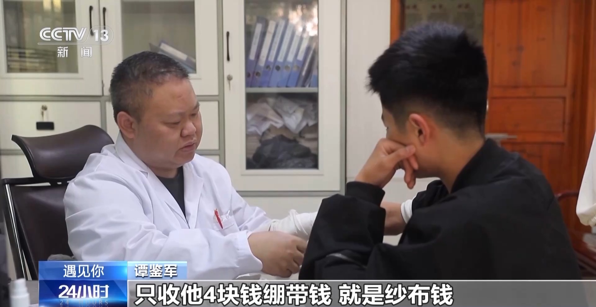 谭鉴军:这个小段,我刚刚给他检查了,只收他4块钱纱布钱。学生脱臼、骨折、脚崴,我们会给他进行手法复位,但是我们从来不收钱,还有小学、幼儿园的学生很喜欢玩弹珠,塞到鼻子上,我们每次取完也不收钱的。