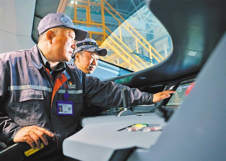 5月28日,中车长客首席操作师罗昭强(前一)在对新一批复兴号智能动车组进行出厂前的质量检查。