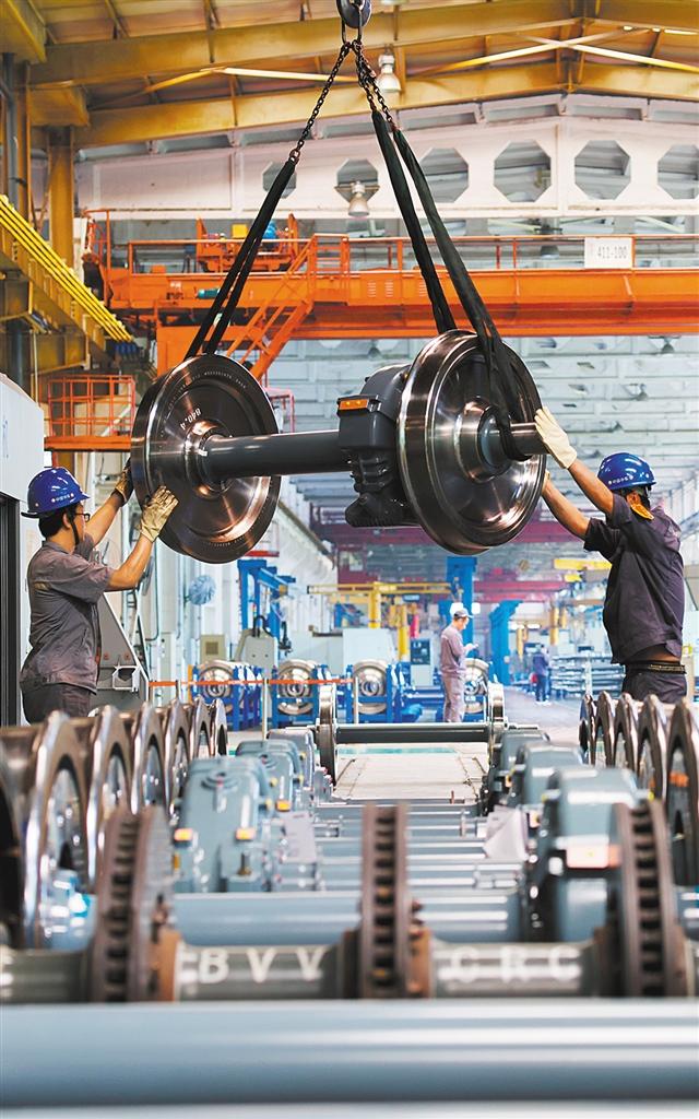 5月28日,中车长客转向架事业部总成产线组,员工在进行城轨轮对压装作业。