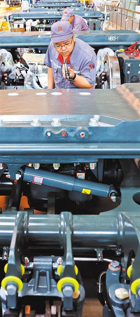 5月28日,中车长客转向架事业部总成产线组,一台台转向架排列在数字化智能产线上。
