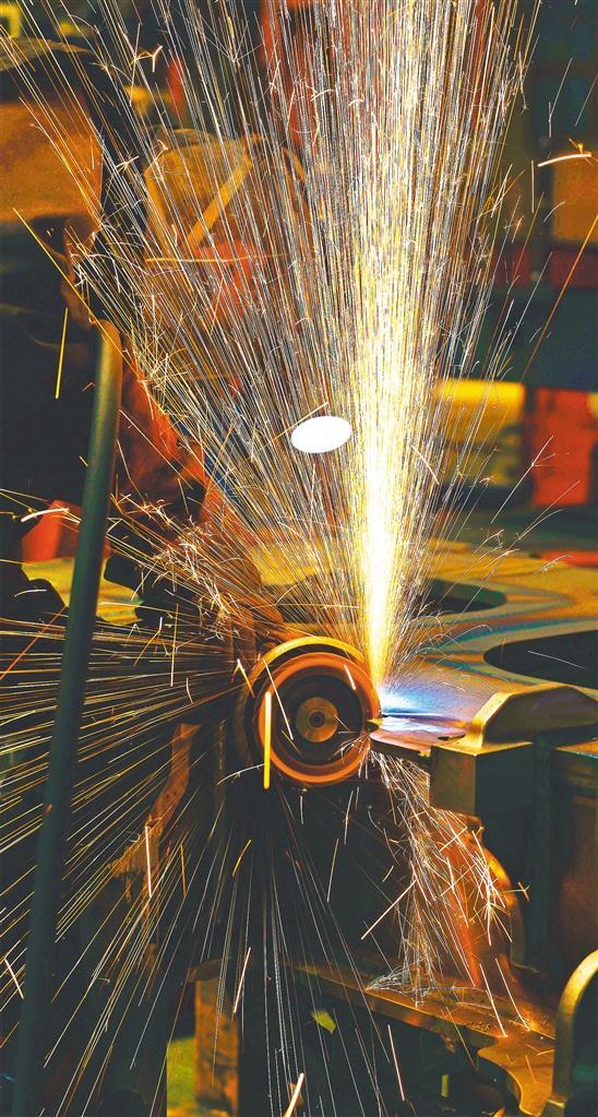 5月28日,中车长客转向架事业部焊接产线组,员工在进行动车组构架横梁焊后修磨作业。