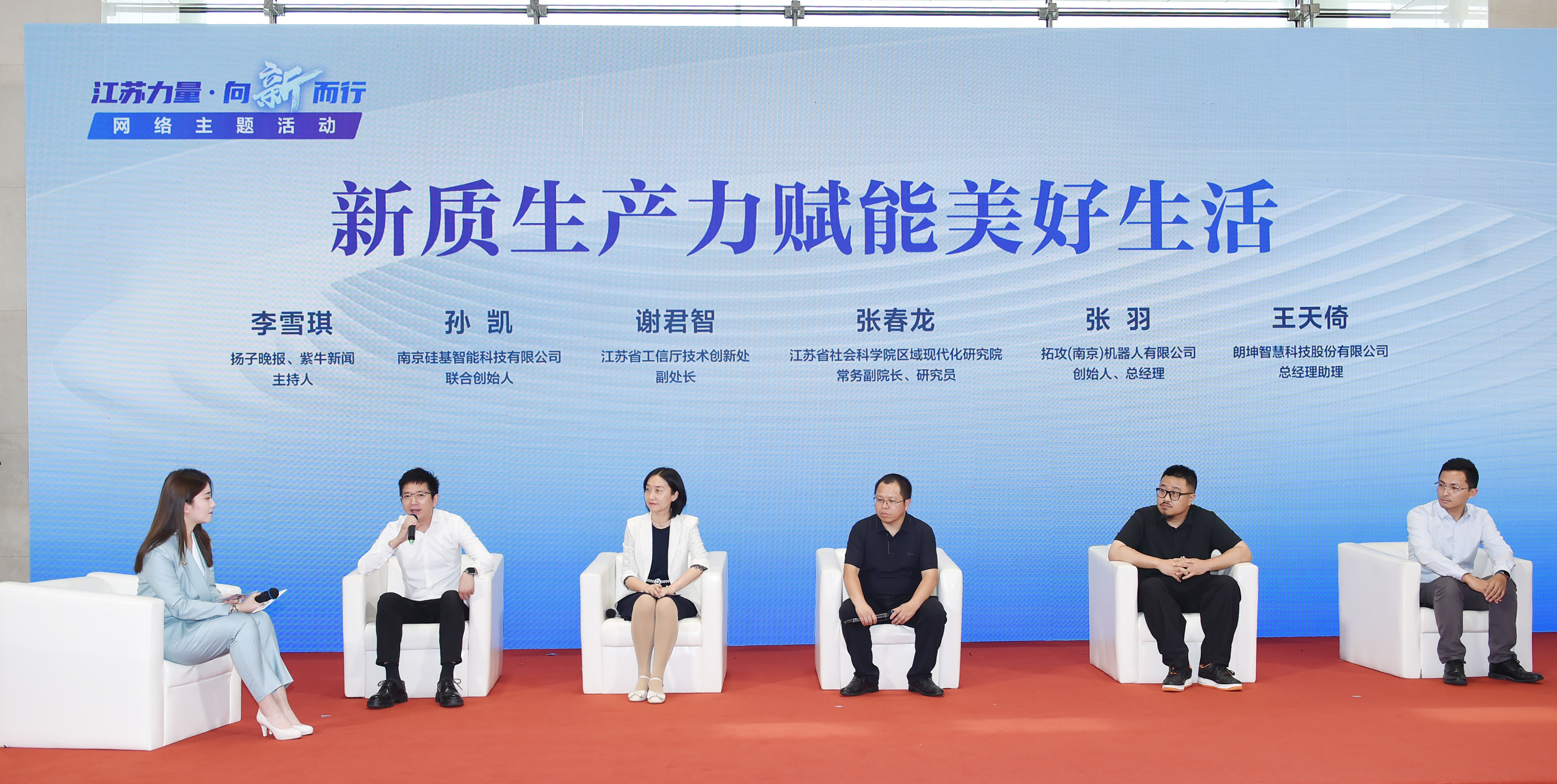 随后,现场举办了“新质生产力赋能美好生活”主题沙龙活动。南京硅基智能科技有限公司、拓攻(南京)机器人有限公司和朗坤智慧科技股份有限公司的相关负责人,分享了对于“新质生产力赋能美好生活、激发经济新动能推动高质量发展以及企业未来愿景”的观点。同时,江苏省工信厅技术创新处副处长谢君智和江苏省社会科学院区域现代化研究院常务副院长、张春龙研究员带来了独到的点评。