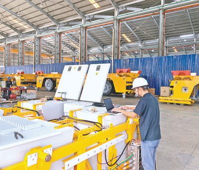 中国工程师正在检测和调试AGV动力电池系统。本报记者 章念生摄